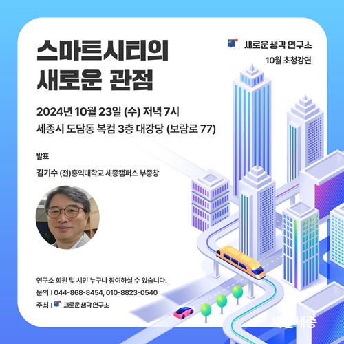 »õ·Î¿î »ý°¢ ¿¬±¸¼Ò(ÀÌÇÏ ¡®»õ·Î¿î »ý°¢¡¯)´Â 10¿ù 23ÀÏ ¼ö¿äÀÏ Àú³á 7½Ã¿¡ ¼¼Á¾Æ¯º°ÀÚÄ¡½Ã µµ´ãµ¿ º¹ÇÕÄ¿¹Â´ÏƼ¼¾ÅÍ 3Ãþ ´ë°´ç¿¡¼ 10¿ù ÃÊû°¿¬È¸¸¦ °³ÃÖÇÑ´Ù. °¿¬ ÁÖÁ¦´Â ¡°½º¸¶Æ® ½ÃƼÀÇ »õ·Î¿î °üÁ¡¡±ÀÌ¸ç ±è±â¼ö Àü È«ÀÍ´ëÇб³ ¼¼Á¾Ä·ÆÛ½º ºÎÃÑÀåÀÇ °¿¬°ú ÁúÀÇÀÀ´äÀ¸·Î À̾îÁø´Ù.