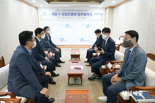 ¼¼Á¾Æ¯º°ÀÚÄ¡½Ã(½ÃÀå ÀÌÃáÈñ)°¡ â¾÷ÁøÈï¿ø(¿øÀå ±è¿ë¹®)°ú 6ÀÏ ½Ãû¿¡¼­ ¾÷¹«Çù¾àÀ» ¸Î°í, ¼¼Á¾½Ã ±â¼úâ¾÷ Ȱ¼ºÈ­¿Í Áö¿ª»ó»ý¿¡ ÈûÀ» ¸ðÀ¸±â·Î Çß´Ù.