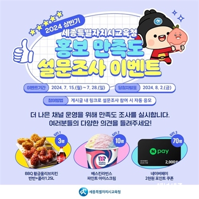 2024 »ó¹Ý±â ¼¼Á¾½Ã±³À°Ã» È«º¸ ¸¸Á·µµ ¼³¹®Á¶»ç À̺¥Æ® À̹ÌÁö¼¼Á¾Æ¯º°ÀÚÄ¡½Ã±³À°Ã»(±³À°°¨ ÃÖ±³Áø, ÀÌÇÏ ¼¼Á¾½Ã±³À°Ã»)Àº ¿À´Â 7¿ù 28ÀϱîÁö ¡®2024 »ó¹Ý...